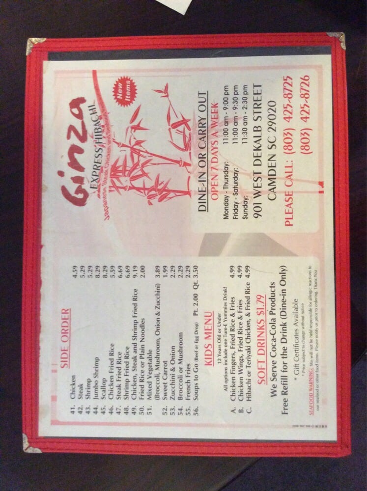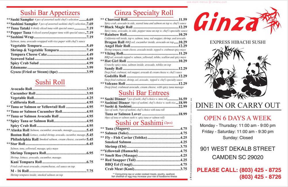Welcome to Ginza Restaurant, a cozy haven for Japanese cuisine in Camden, SC. Famous for its delightful sushi offerings, Ginza boasts a menu that features both classic favorites and innovative rolls. Highlights include the Charcoal Roll, a delicious combination of spicy crab and seared fish, as well as the vibrant Rainbow Roll, perfect for those who love freshness in every bite.